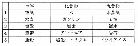 単体、化合物及び混合物の組合せで、次のうち正しいものはどれか。
